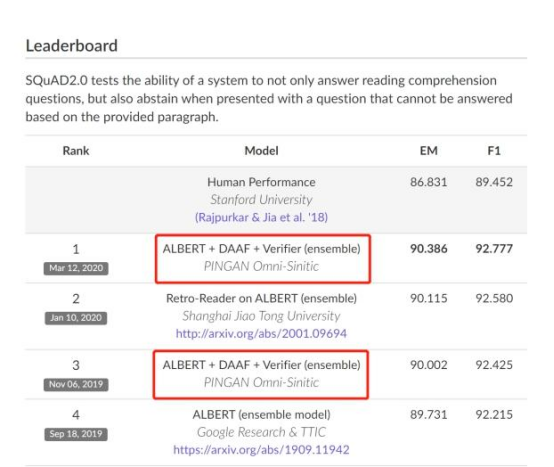 SQuAD2.0是自然语言处理的阅读理解领域最具权威性的积分榜,多年来,诸多来自全球学术界和产业界的研究团队都积极地参与其中。平安科技凭借在机器阅读理解领域多年研发积累,从2019年起多次在该榜单位居前列,尤其2019年7月份和11月份,数次战胜谷歌、科大讯飞等实力强劲选手登上榜单第一名,这是平安科技第三次登顶。