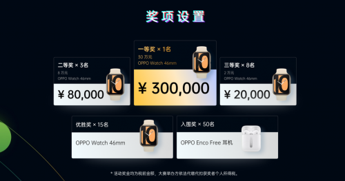 一等奖1名:获奖个人/团队将获得OPPO提供的30万元奖金,以及OPPO Watch 46mm智能手表作为奖品。