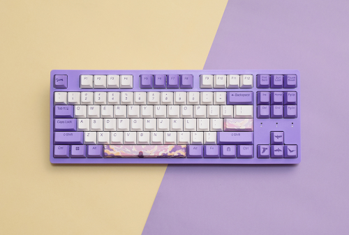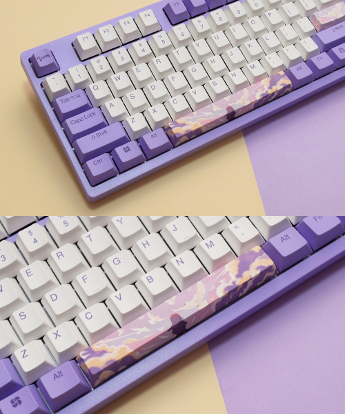 “梦遇”机械键盘以“梦”为题,作为“浪漫”系列的开端,粉紫与白色的组合浪漫温馨,如少女深藏于心里的梦境,梦幻而充满遐想——仰头注视的少女身处于云霞与漫天轻羽之中,似幻似真,如梦如画,仿佛一切美好尽在,触手可及。