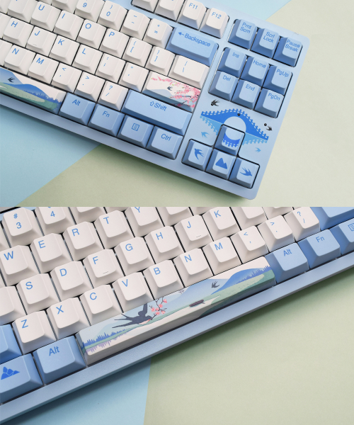 “归燕”机械键盘是设计系列“四季”的首款产品,以“春日”为题,蓝白的清新配色,水墨风的春之画卷,极尽视觉营造的功夫,更精湛的五面热升华,在大键位上生动地描绘了万物复苏,风轻浪平,“归燕”鸣春的景象。