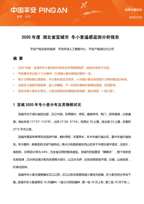 近期,作为平安援鄂抗疫惠农系列举措的其中一项工作,平安产险、平安科技携手,根据当期冬小麦春耕管理面临的问题和需求,将平安智慧遥感认知平台遥感AI线上监察服务应用到了湖北襄阳宜城市冬小麦长势智能监测分析上。并于近期发布了第一份《2020年度湖北省宜城市 冬小麦遥感监测分析报告》(下称“报告”)。