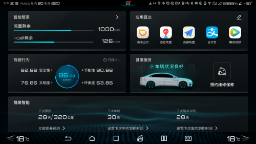 车机负一屏是DiLink 3.0为车主打造的专属智能快捷服务平台,用户通过右滑屏幕主页到达负一屏,该功能为业内首创。专属定制服务,用户可凭借个人喜好对负一屏内容进行设置,不仅包含了账号信息、消息通知、智能管家和商城应用等,更有随时对用户的驾驶习惯和车况进行监测分析的功能,保障用户的行车安全。