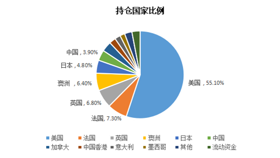 在持仓国家占比中,美国公司超过一半,而基建大国中国占比仅为3.9%。