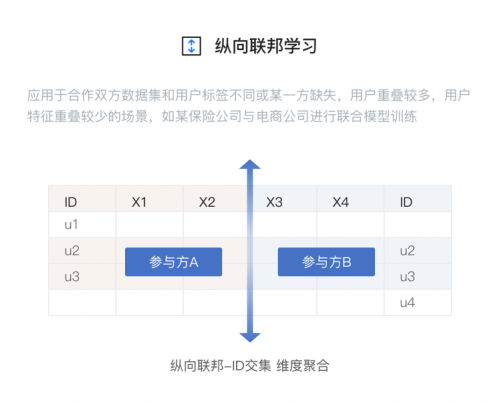 纵向联邦建模针对的是相同用户的数据,但是用户数据维度特征却不一致。比如互联网公司与金融机构,面对同样一位有贷款需求的人,互联网公司能提供用户上网习惯等数据,而银行则拥有用户的征信记录、个人信息等数据,这时候蜂巢则通过纵向联邦建模场景,汇集双方用户特征,增强双方模型的效果。