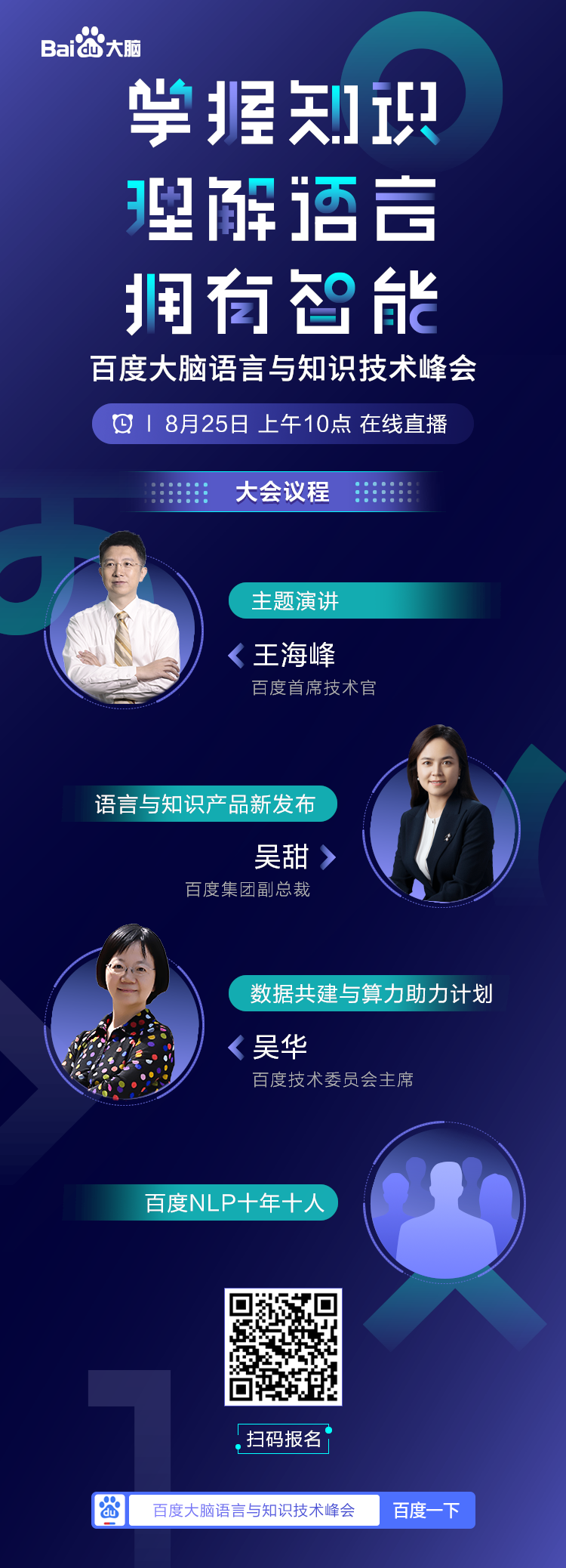 在AI领域,百度的技术实力和人才储备有目共睹,处于中国乃至世界科技企业的前列。2010年,自然语言处理领域知名专家王海峰博士加盟百度,成立了“自然语言处理部”。自此经年,百度NLP聚集了一大批兼具扎实技术实力和实践经验的AI人才。据透露,会上也将首次向业内介绍百度NLP十年的“代表人物”。