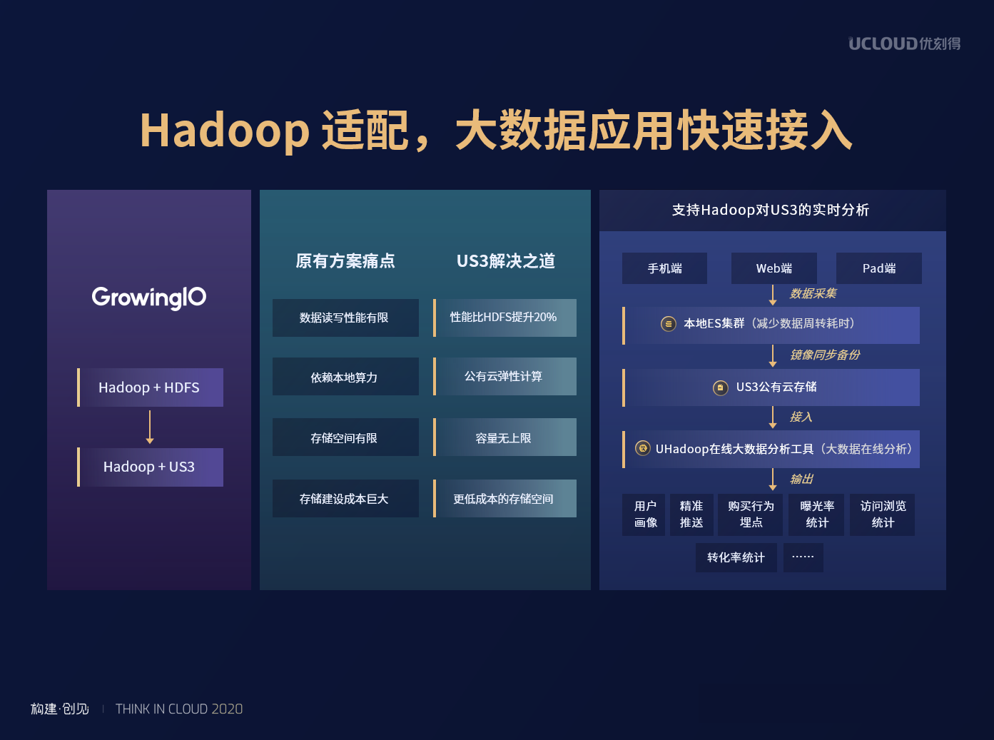 近年来电商行业蓬勃发展,对大数据场景有了更多探索。很多用户往往是通过购买云主机搭建Hadoop集群,利用云主机本地盘构建HDFS集群,进行大数据的存储。这种方案不仅存储空间有限、不易于扩容,且建设成本颇高。US3对象存储提供的Hadoop适配工具,为某电商服务公司实现Hadoop集群的数据接入,将大量分析数据存储在对象存储中。实现计算与存储分离,不仅可以获得更低的存储成本,也无需再担心存储集群扩容问题。除了接入客户自建的Hadoop集群,US3对象存储还可对接ES集群进行数据采集,使用托管的UHadoop集群实现数据分析,协助还不具备大数据集群运维能力的用户简化数据分析的难度。
