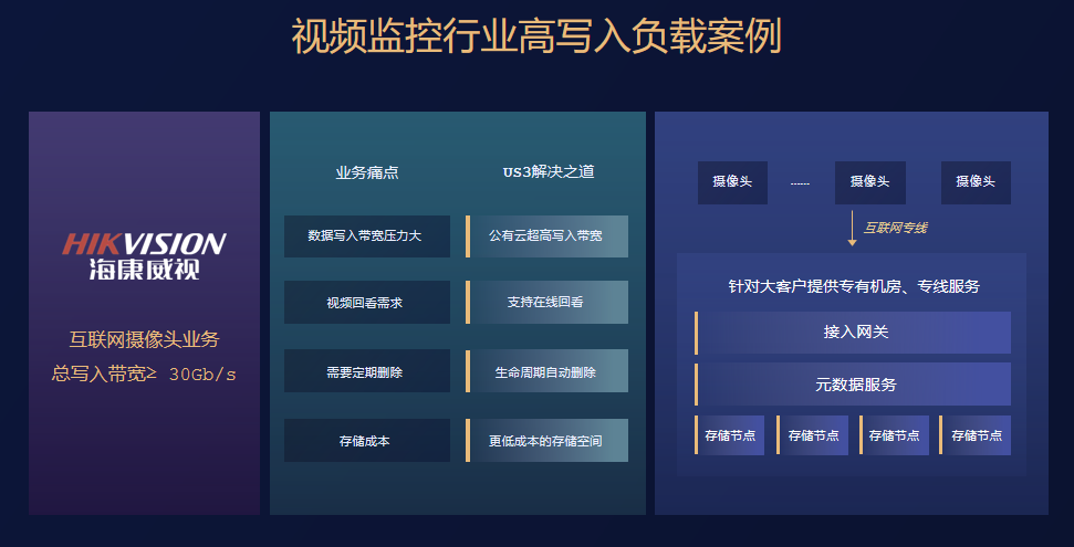 视频监控行业的快速发展,让网络高清摄像头进入了我们的生活。伴随着业务快速增长,数据云存储写入带宽的压力也随之而来。UCloud优刻得为某视频监控领域头部企业,提供单个存储区域可承载30G/s的写入带宽,2021年预计将达到100G/s。视频往往存在实时回看的需求,这就意味着更高的可用性挑战。US3在实际生产环境验证可达到99.999%的可用性,通过专有机房配合专线的定制化服务模式,能够满足重点客户海量视频数据的写入带宽需求。