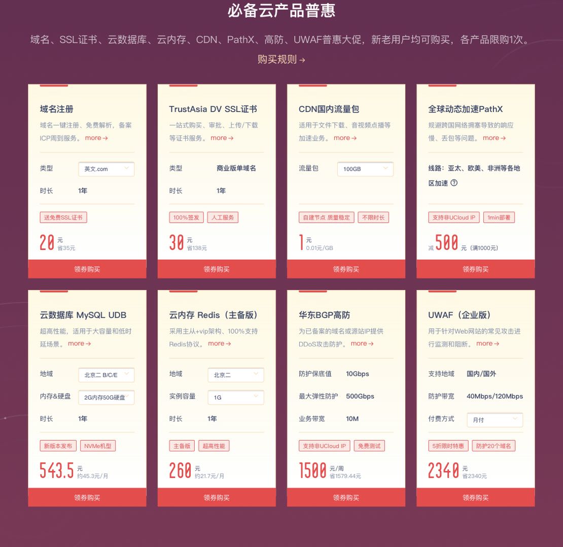 除了上述这些产品外,UCloud还设置了多个特惠分会场,如全球云产品专场、CDN特惠专场、云安全专场、大数据专场等。无论想要哪种云产品或者进行怎样的个性化搭配,UCloud旗下产品均可快速组合,形成高性价比解决方案。