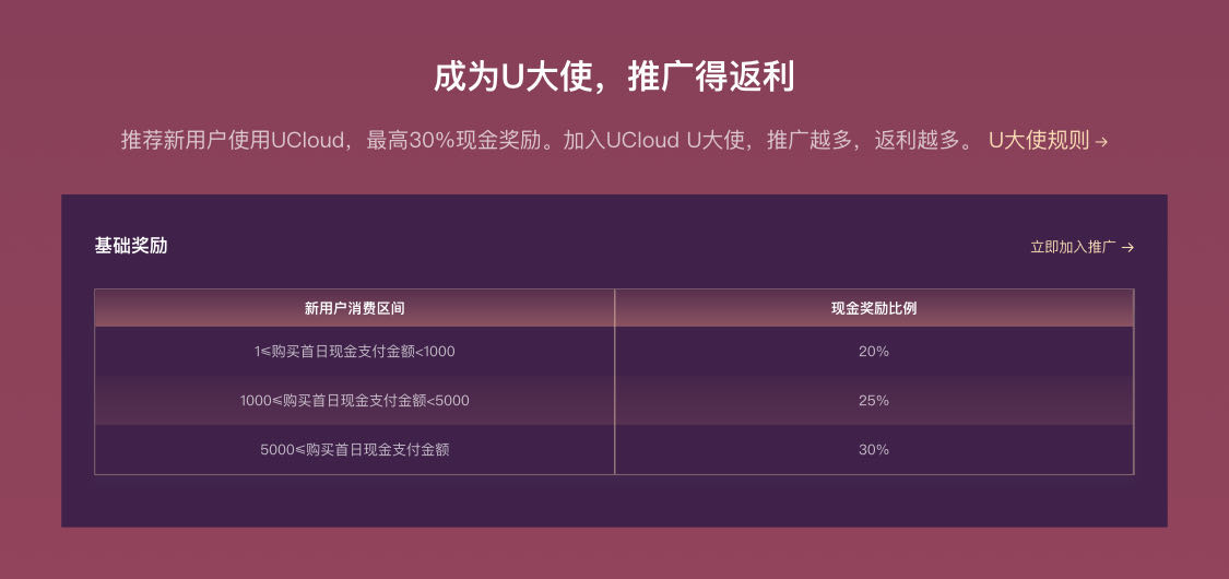 UCloud在今年特别推出了U大使活动。 加入U大使,推荐新用户使用UCloud,就能享受最高30%的现金奖励。根据规则,新用户消费在 1-1000元,1000-5000元,以及超过5000元,推荐者就能享受不同比例的现金奖励,幅度从20%-30%不等。