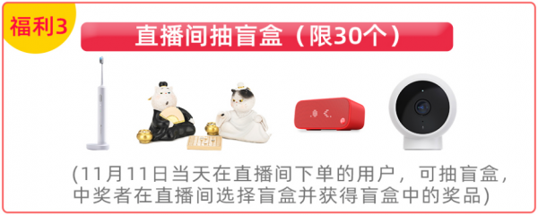 福利三:抽惊喜盲盒。11月11日当天在直播间下单的用户,可抽盲盒,中奖者在直播间选择盲盒并获得盲盒中的奖品,究竟是什么奖品,全凭好运呦~