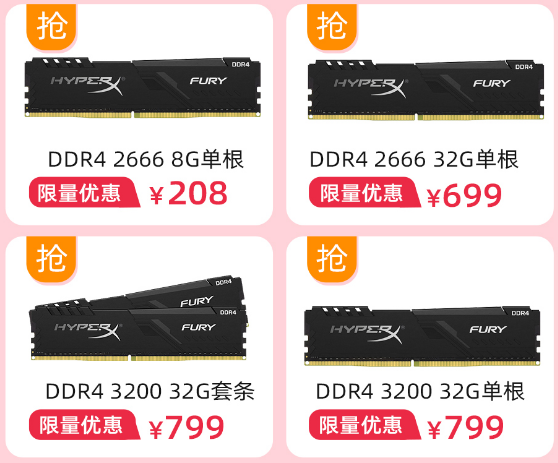 此外,还有DDR4 2666 8GB单条208元,DDR4 2666 32GB单条699元,DDR4 3200 32GB套条799元,DDR4 3200 32GB单条799元。