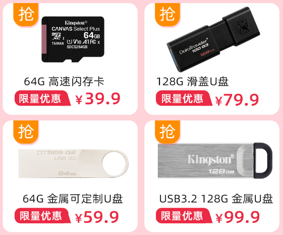 11月11日00:00开始,60分钟内多款好物限时限量特惠,64GB高速闪存卡39.9元,128GB滑盖闪存盘79.9元,64GB金属壳定制闪存盘59.9元,USB3.2 128GB金属闪存盘99.9元。