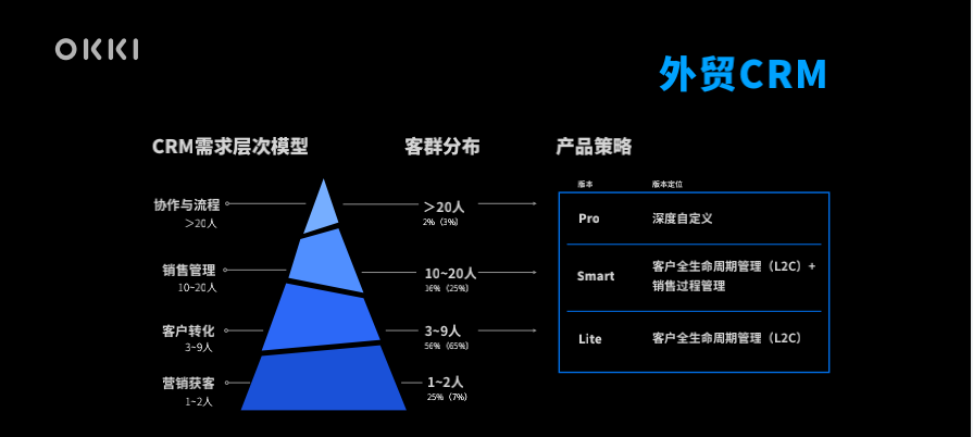 针对这部分客户的需求,我们推出了OKKI CRM Smart,在客户全生命周期管理的基础之上,加上销售过程的管理,帮这些企业把好的方法论用工具去落地下来。