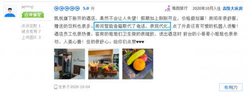其次,在运营流程上,以客需服务举例,通过A.I.音箱的语音机器人接收并响应需求,同步进行数字化记录和传递,在客人说完的下一秒,智能系统就已经对客人需求进行分析,并传递到直接负责的员工手中,这个员工也是经过系统智能分发、选择在值班或最快时间的人来做,这个过程是低耗时、敏捷的、数字化的。