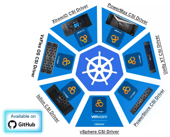 如果Kubernetes的环境是搭建在vSphere环境之上,客户就可以直接利用CSI访问vSphere环境里的vSAN、VMFS或NFS存储,但如果Kubernetes不是在VMware环境之上或者对存储有其他要求,比如性能、扩展性等,则可以选择戴尔科技的企业级存储。