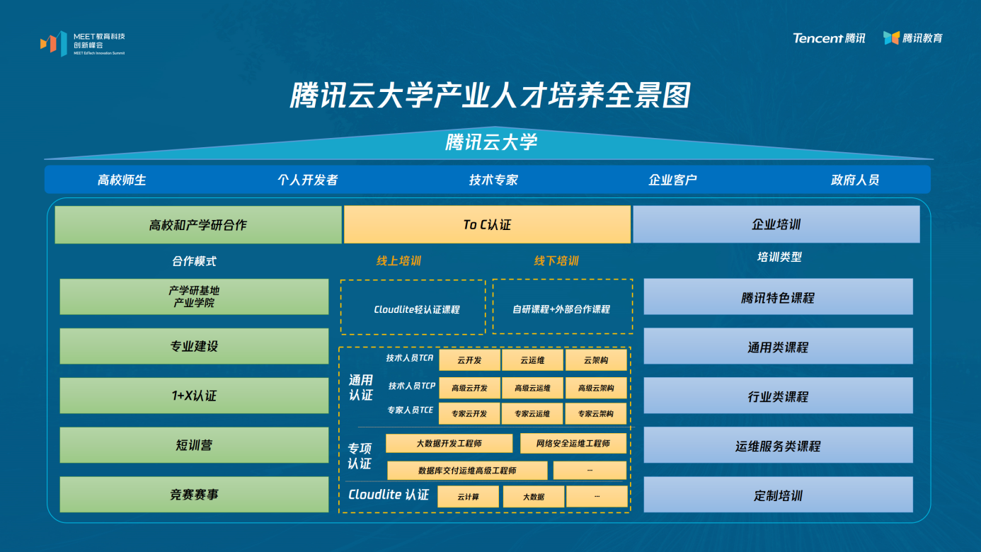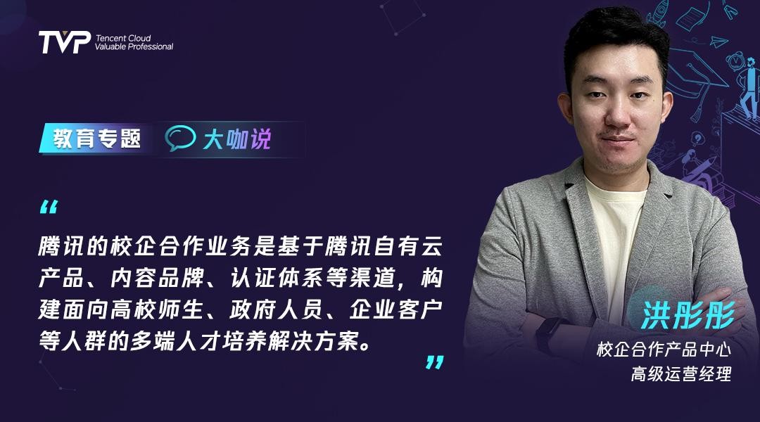 “腾讯的校企合作业务是基于腾讯自有云产品、内容品牌、认证体系等渠道,构建面向高校师生、政府人员、企业客户等人群的多端人次培养解决方案。”
