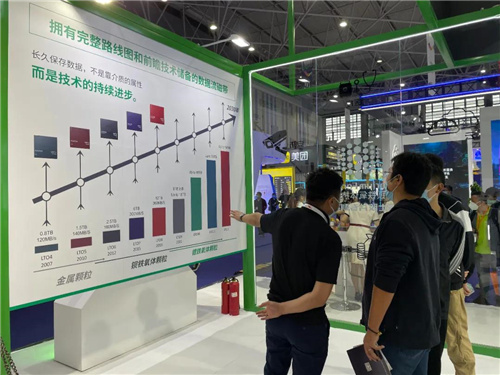 2021数博会上,富士胶片还展示了他们在磁颗粒方面的突破性成果——锶铁氧体磁性颗粒磁带。这是富士胶片和IBM的最新研发成果,是目前全球最大单盘存储容量磁带。能够实现全球最大580TB的单盘存储容量,实现每平方英寸317千兆字节的存储容量,刷新了三年前创下的330TB最高容量纪录。