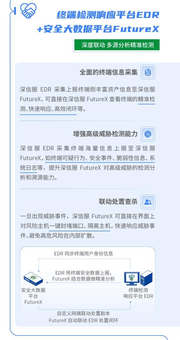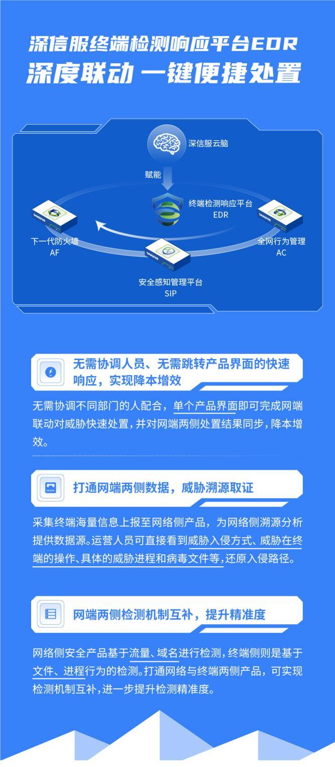 深信服终端检测响应平台EDR联动下一代防火墙AF、安全感知管理平台SIP、全网行为管理AC、安全大数据平台FutureX等多个安全产品,实现安全事件精准检测、快速响应、高效闭环。