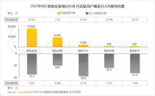 市场不断教育之下,智能设备行业近年来保持高速增长态势。QuestMobile数据显示,继2021年首次突破2亿大关后,智能设备行业月活跃用户规模截至2021年9月已超2.5亿人,同比增长达26.4%。特别是2021年3月,智能设备行业月活跃用户规模出现明显提升,同比增长高达70.6%。