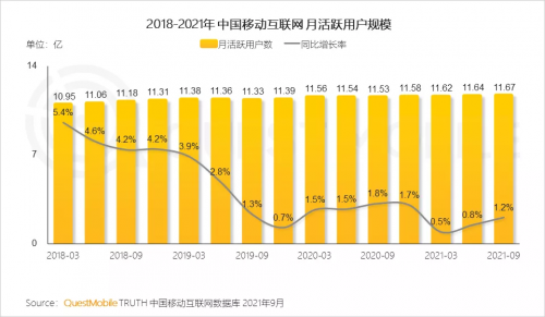 随着移动互联网普及率提高,移动互联网用户规模增速稳中放缓,开始面临总人口天花板。QuestMobile数据显示,截至2021年9月,移动互联网网民总人数11.67亿人,相比2020年9月的11.53亿人,同比仅增加了1400万。