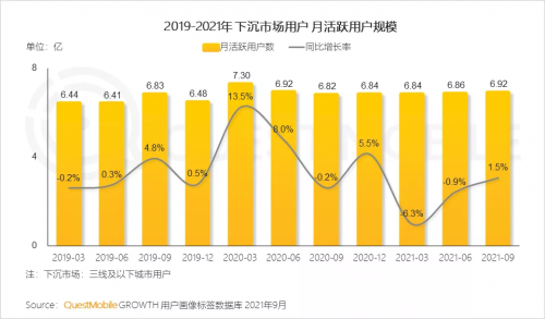 备受瞩目的是,受到新冠疫情的影响,下沉市场的网民生活方式被迫改变,月活跃用户数在2020年3月达到7.3亿人的峰值,并在2021年9月保持在6.92亿人左右。如何服务庞大的下沉市场用户数,成为互联网企业持续发展必须纳入考虑的重要策略。