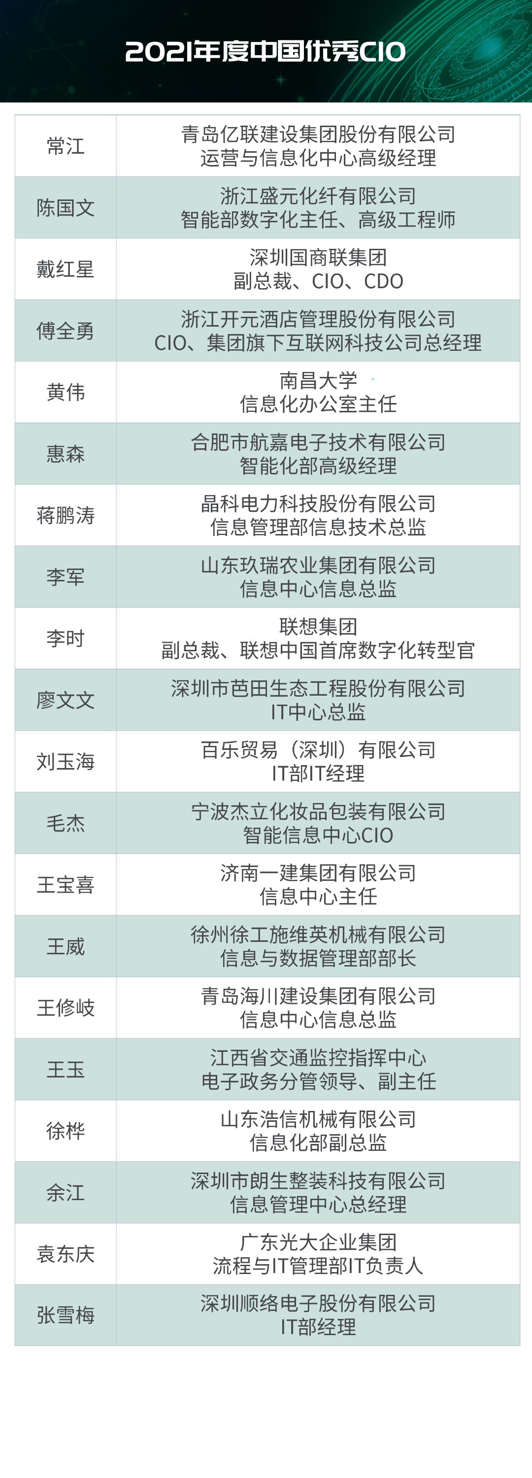 1月18日,由计世传媒集团、计算机世界、计世研究院、CMO俱乐部主办,华南CIO联盟、江西省两化融合推进联盟、广东省CIO联盟、海南省信息协会、山东CIO联盟协办的“纵深数字化新征程——2021年度IT大赏暨中国优秀CIO评选”结果揭晓。