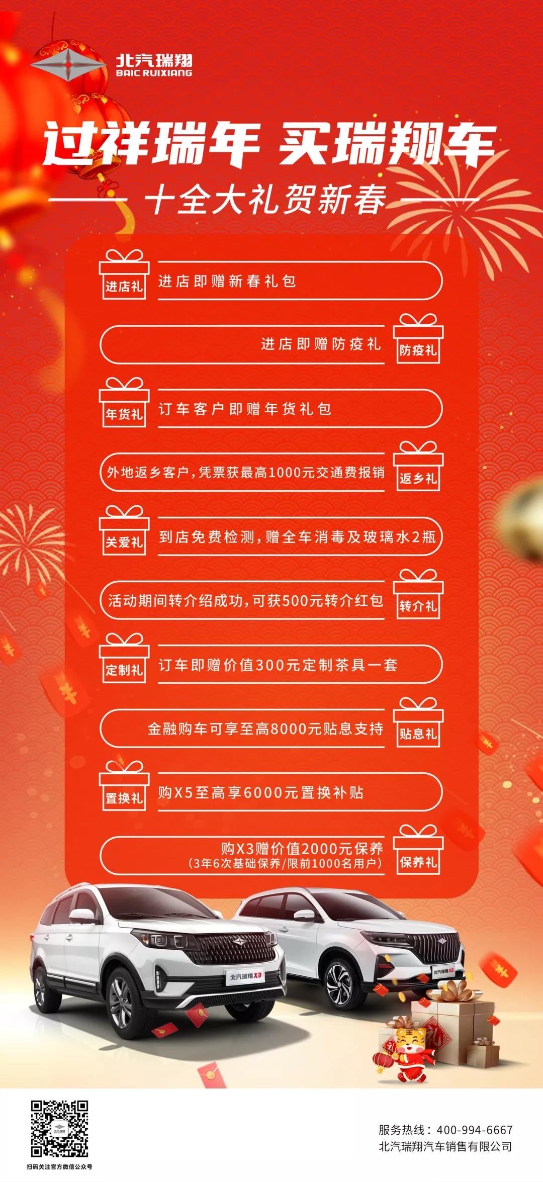 选择没有最佳,只有更佳。高品质适配春节出行需求,让劳动所得每一分花得值,更有诚意新春好礼相赠,这个春节,用年终奖购买一台北汽瑞翔X5是一个不错的选择。过祥瑞年,买瑞翔车,新春来临之际,北汽瑞翔祝福您在新的一年里,笃行不怠,勇往直前,向着新时代的幸福生活不断前行。