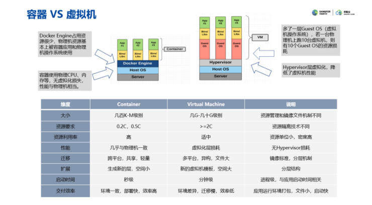 除了容器技术生态外,容器还有着其他的重要概念。Docker和虚拟机都是资源隔离的方案。Docker是基于OS的资源隔离技术,Docker Engine占用资源很少,物理机资源基本上被容器应用和物理机操作系统使用。虚拟机多了一层Guest OS(虚拟机操作系统),若一台物理机上跑10台虚拟机,则有10个Guest OS的资源损耗,Hypervisor层虚拟化,降低了虚拟机性能。