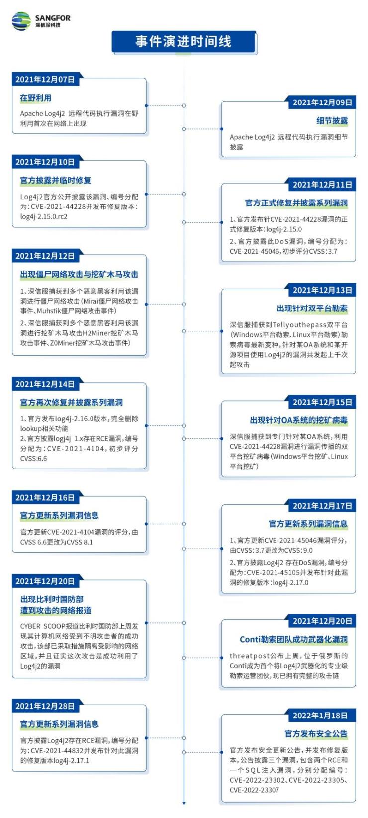 该漏洞还被广泛应用于勒索、挖矿、僵尸网络上,黑产组织利用漏洞发起多个攻击事件。深信服对此梳理了完整的事件演进时间线: