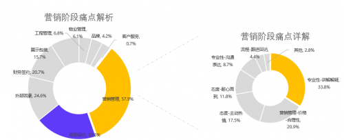 在营销阶段,客户反馈问题集中在营销管理,占比高达57.9%,而在其中,销售人员的专业性又是最大的体验痛点。卓思研究发现,买房客户对拥有专业知识的销售人员好感度较高,耐心的讲解答疑是赢得好感度的杀手锏;反之,客户非常讨厌“无限营销又没有什么干货的销售话术”,以及“喋喋不休地贬低其他竞争对手的行为”。