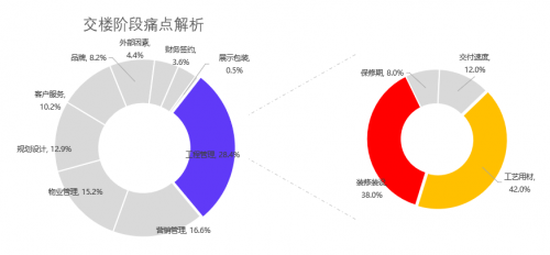 毫无意外,交楼阶段的最大痛点落在了工程质量上,占比约三分之一,而其中近一半问题是工艺用材不达标。