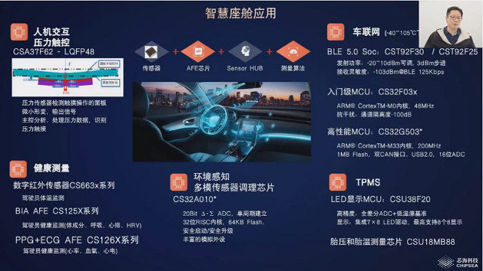 芯海科技作为全信号链IC领军企业,目前已开发出多款MCU芯片产品,在本次会议上,芯海科技资深FAE彭毅介绍了芯海科技的高性能信号链MCU芯片CSA37F62,该芯片目前已经通过AEC Q100认证,芯片内部包含高性能的MCU内核,高性能的放大器以及高精度的ADC,采用了先进的芯片开发流程,提高设计冗余度,及完备的验证方法学、测试方法学保证芯片的质量,同时支持支持多种通讯接口。产品可应用于各类压力测量,比如按键压力,座椅压力等,提升座舱的科技感和用户体验。
