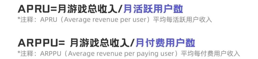 APRU反映的是总体收入在整体用户中的情况,这个数值通常会远小于ARPPU,但是可以评估各个用户获取渠道的质量。而游戏公司的运营目标也是让更多的用户变成付费用户,这也就是为什么很多游戏经常会有首充礼包,花1块钱就会得到价值几百元的礼包等等,并且重复提醒,就是为了提高付费率。并且,通过这两个数据我们也可以进行产品的优化:比如某游戏ARPU很低,但ARPPU很高,那说明该游戏付费用户的付费能力强,那游戏公司就可以做一些付费功能优化,提供专属客服等。再比如某游戏ARPPU很低,但ARPU较高,说明大多数玩家喜欢投入小额金钱,游戏公司就可以针对这部分玩家,增加一些小额礼包等。