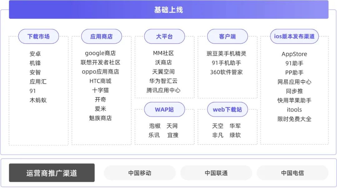 现在的游戏企业和发行商都有这样的一个难题,就是如何找到优质流量、如何低成本的触达并且圈住用户。现在的游戏行业的公域也是分很多种,先以基础上线和运营商渠道推广为例。
