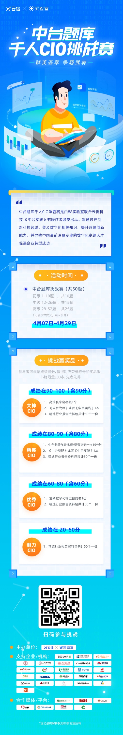 在这样的背景之下,云徙联合88实验室,携手《中台实践》书籍作者,发起本次《中台题库 千人CIO挑战赛》,以普及中台建设相关知识、帮助企业数字化负责人自测,并挖掘更多数字化高端人才,最终助力企业顺利推进数字化转型。