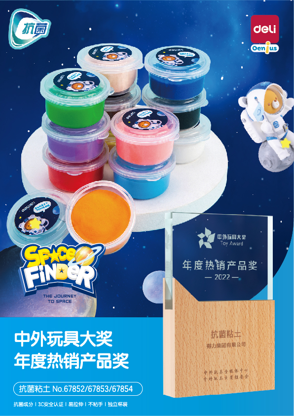 粘土作为幼儿手工的主流产品,安全尤为重要。得力益智关注消费者需求,开发出抗菌系列粘土,配方升级,添加银离子抗菌成分,抗菌效力达99%。此外,得力益智抗菌粘土通过国家3C认证、欧盟EN71-3玩具安全检测、国家化妆品安全技术规范皮肤刺激性测试、欧盟EN71-9防腐剂安全检测、美国药典USP40(61)、美国药典USP40(51)等多种安全标准,全面保障儿童使用安全。
