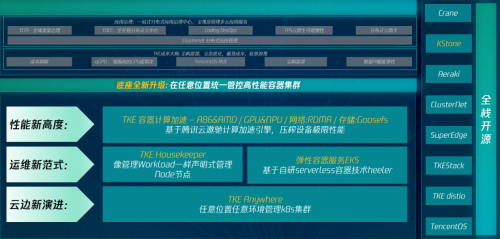 具体来说,在云边新演进方面,企业在上云过程中为了提高效率,往往会采用多云或混合IT战略,但随之而来的便是在公有云、私有云、边缘云等庞大基础设施下管理的复杂性和分散性。针对这一点,腾讯云推出全新能力——TKE Anywhere,可以让企业在任意环境、任意位置、任意集群,无差异的获取腾讯公有云原生的能力,实现多云资源的统一纳管。同时,腾讯云还将包括Crane、KStone、Aeraki在内近10种云原生分布式云技术栈全面开源,企业还可根据自身需求搭建一个良好的云原生底座。