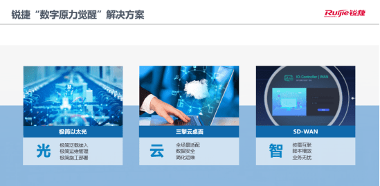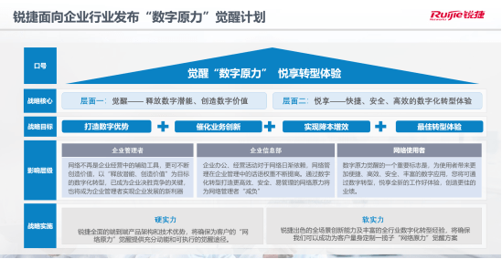 为助力企业应对上述数字转型挑战,解决应用场景痛点并实现提效降本、获取更强的市场竞争优势,锐捷网络面向企业行业发布的数字原力觉醒计划,旨在通过极简光、三擎云桌面、SD-WAN解决方案,以光、云、智之力,助力企业觉醒数字力量,提高竞争力,并通过锐捷网络优异的全场景创新能力及丰富的全行业数字化转型经验,使客户悦享转型体验。