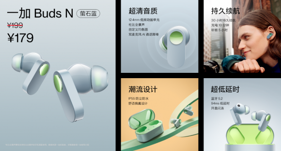 除一加 Ace竞速版之外,一加还带来了一加无线蓝牙耳机 Buds N的全新配色——萤石蓝。一加 Buds N拥有12.4mm超大低频动圈单元,最高支持30小时的续航,单支仅4.8g,佩戴舒适听感优秀。新推出的萤石蓝配色款采用了内外撞色的设计,更显时尚精致。