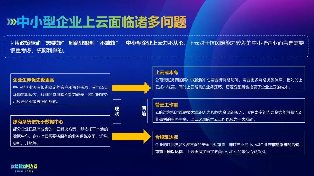 《框架》指出,“上云成本高”、“管云工作重”、“合规难达标”一直是中小型企业上云的痛点和难点。公有云服务商的集中式数据中心需要跨网络访问,需要更多网络资源保障,无形中增加企业上云成本。同时,上云所需的业务迁移、资源变配等也抬高了企业上云的综合成本;云的运营和运维需要大量的人力和物力资源的投入,中小型企业没有太多的人力物力投入到非盈利的事务中来,上云之后的管云工作也成为一大难题;企业的IT系统涉及多方面的安全合规审查,非IT产业的中小型企业在信息系统的合规审查上难以达标,上云更是加重了中小企业的等保合规负担。