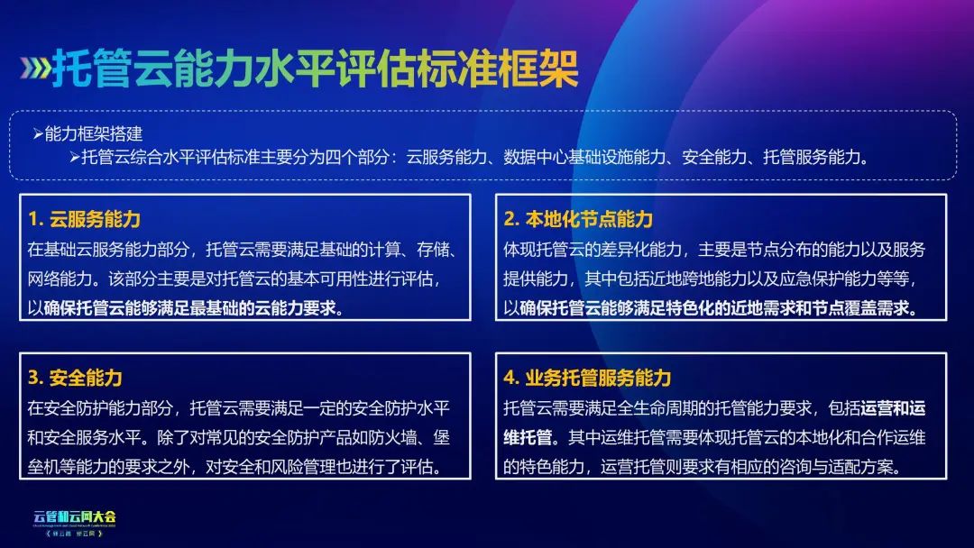 大会揭晓了托管云能力框架,包括云服务能力、数据中心基础设施能力、安全能力、托管服务能力。在云服务能力上,托管云需要具备基础云服务能力,能够满足基础的计算、存储、网络能力;在本地化节点能力上,托管云节点分布能力以及服务提供能力需要满足特色化的近地需求和节点覆盖需求;在安全能力上,托管云需要满足一定的安全防护水平和安全服务水平;在业务托管服务能力上,托管云需要满足全生命周期的托管能力要求,包括运营和运维托管,运营托管则要求有相应的咨询与适配方案,运维托管需要体现托管云的本地化和合作运维的特色能力。