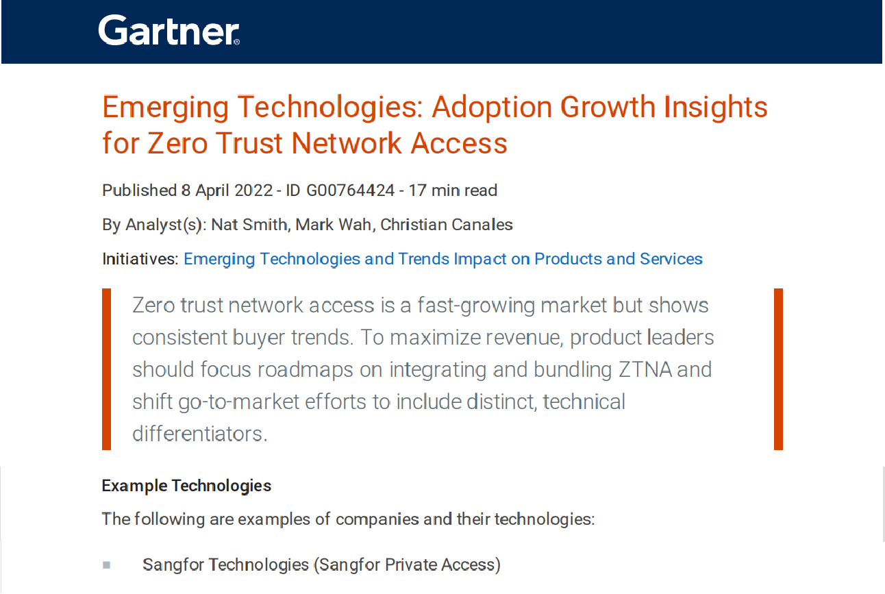 近期,权威第三方分析机构Gartner发布了《新兴技术:零信任网络访问(ZTNA)市场增长洞察》研究报告,深信服作为国内零信任厂商代表成功入围,技术实力再次获得国际认可。