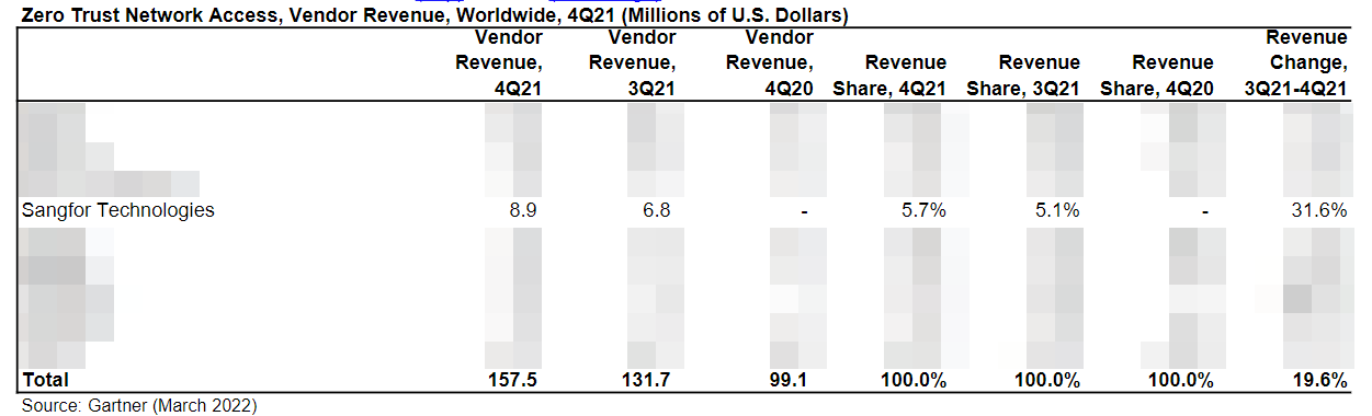 深信服零信任2021年Q4全球市场份额第5