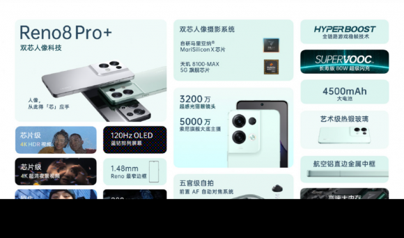 在性能方面,Reno8搭载了天玑1300处理器,Reno8 Pro首发搭载了骁龙7 Gen 1处理器,Reno8 Pro+搭载天玑8100-MAX年度旗舰芯片,分别带来不同性能表现的提升,满足大家对性能强劲程度的需求。考虑到Reno8 Pro和Reno8 Pro+的“双芯”加持,功耗和发热有所提升,所以前者配备了3D恒冷中央散热系统,VC均热冷凝板面积相比前代提升2.5倍,后者配备行业独家超晶石墨散热方,不仅高达高达6465m㎡的总散热面积是前代2.5倍,热导率效也提升了45%,无论是拍摄还是游戏都能保持合理温控,确保手机性能的深度释放。