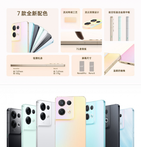 作为主打颜值和影像体验的手机,OPPO Reno8系列采用全新的流云双镜设计,延续Find X系列一体化造型,辅之以75°微弧和艺术品级别的热锻工艺,带来浑然一体、天花板级别的高颜值外观,并提供7种配色可选。同时,Reno8系列还针对内部元器件堆叠方案进行优化,令Reno8 Pro+的机身厚度压缩至7.34mm厚和183g重,带来极致轻薄的手感,令手感与观感平衡统一。