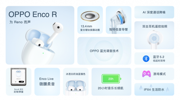 此外,与Reno8系列同期发布的多项loT产品也各有亮点,OPPO Pad Air延续拼接设计风格,以高颜值轻薄机身呈现,并拥有出色的屏幕、持久的续航和完善生态,是日常学习娱乐的好帮手。OPPO Enco R凭借冰透白和奶油蓝两款可爱配色,13.4 mm 复合镀钛振膜动圈带来的高颜值、高音质体验,被很多人认为是“为Reno而声”的耳机。还有80W车载闪充就更加实用,凡是USB-A、USB-C双孔快充都能快速充电,即便是不在家中也能给手机迅速补足电量。