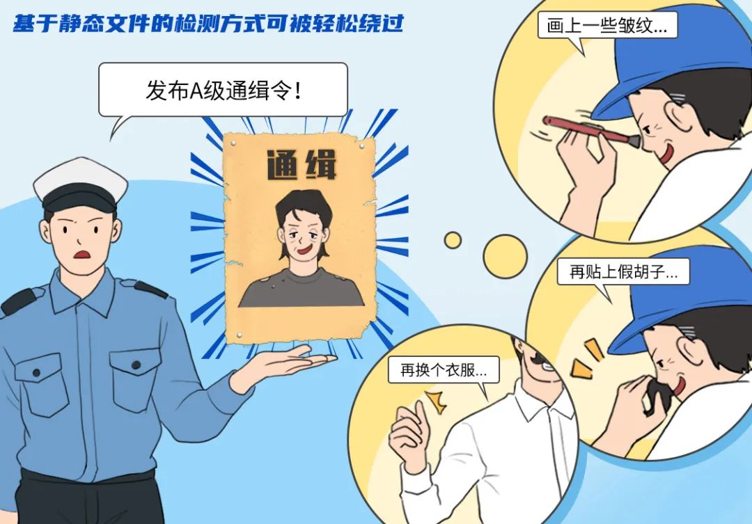 威胁可伪装,但在终端侧的行为却无法隐瞒。这就如同通缉犯,不管如何伪装、隐藏特征,最终还是会在人或物品上产生恶意行为。