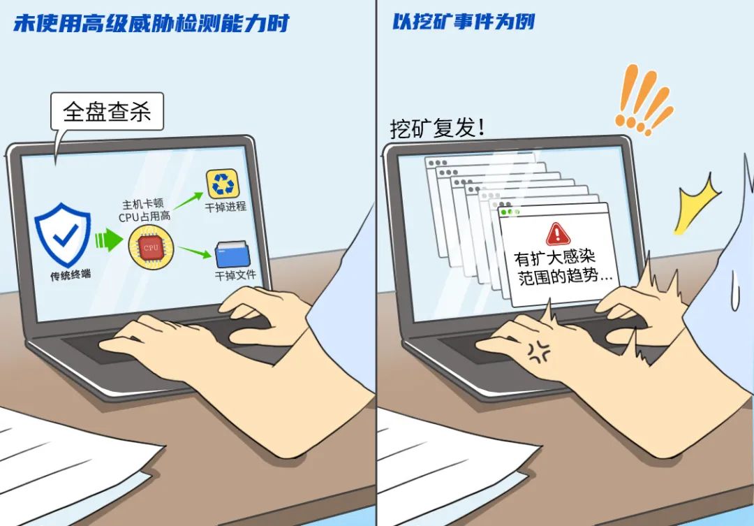 未具备全面行为检测能力的终端:当用户发现终端卡顿、CPU占用率高,立即使用杀毒软件进行全盘扫描查杀,在点击“处置”相关威胁文件、进程后,电脑恢复正常。然而次日上班打开电脑,再次出现电脑卡顿现象,于是再次使用杀毒软件、专杀工具查杀。最终,陷入病毒查杀循环,浪费人力精力。