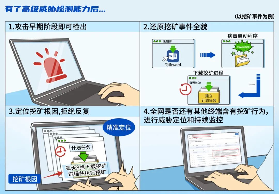 具备了全面行为检测能力的终端:在攻击早期阶段便可检出高级威胁(即:挖矿还未在终端落地时就能提前发现),同时可以还原挖矿事件全过程并持续监控。