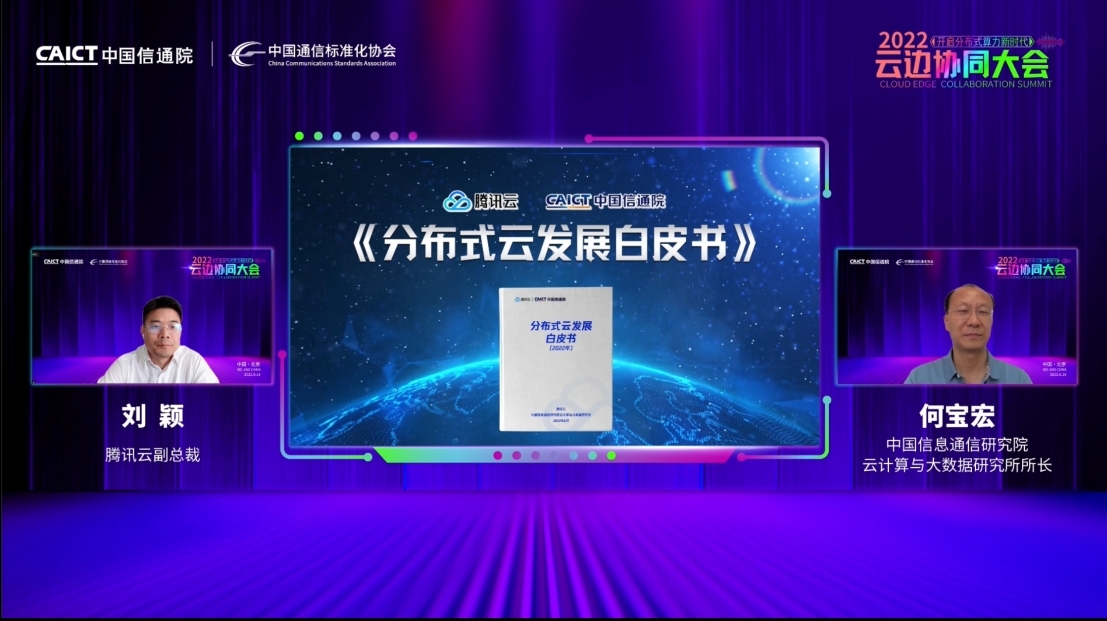 中国信通院云计算与大数据研究所所长何宝宏与腾讯云副总裁刘颖共同发布业界首个《分布式云发展白皮书(2022)》